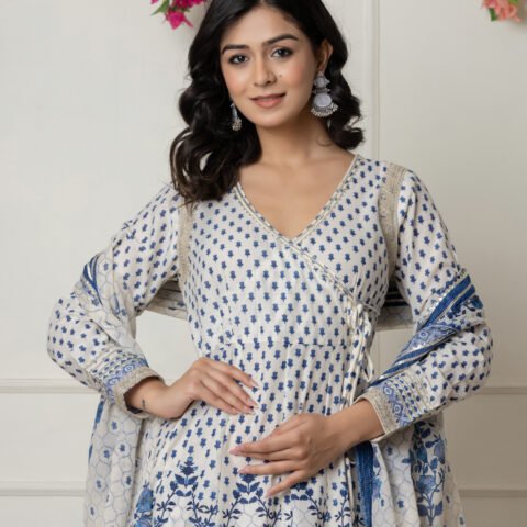 Angrakha kurtis with crossover panels, frequently with thread work, mirror decorations, or gota putti, are coming back into style. These are especially popular in soft or pastel colors, which combine royal style with modern taste.
